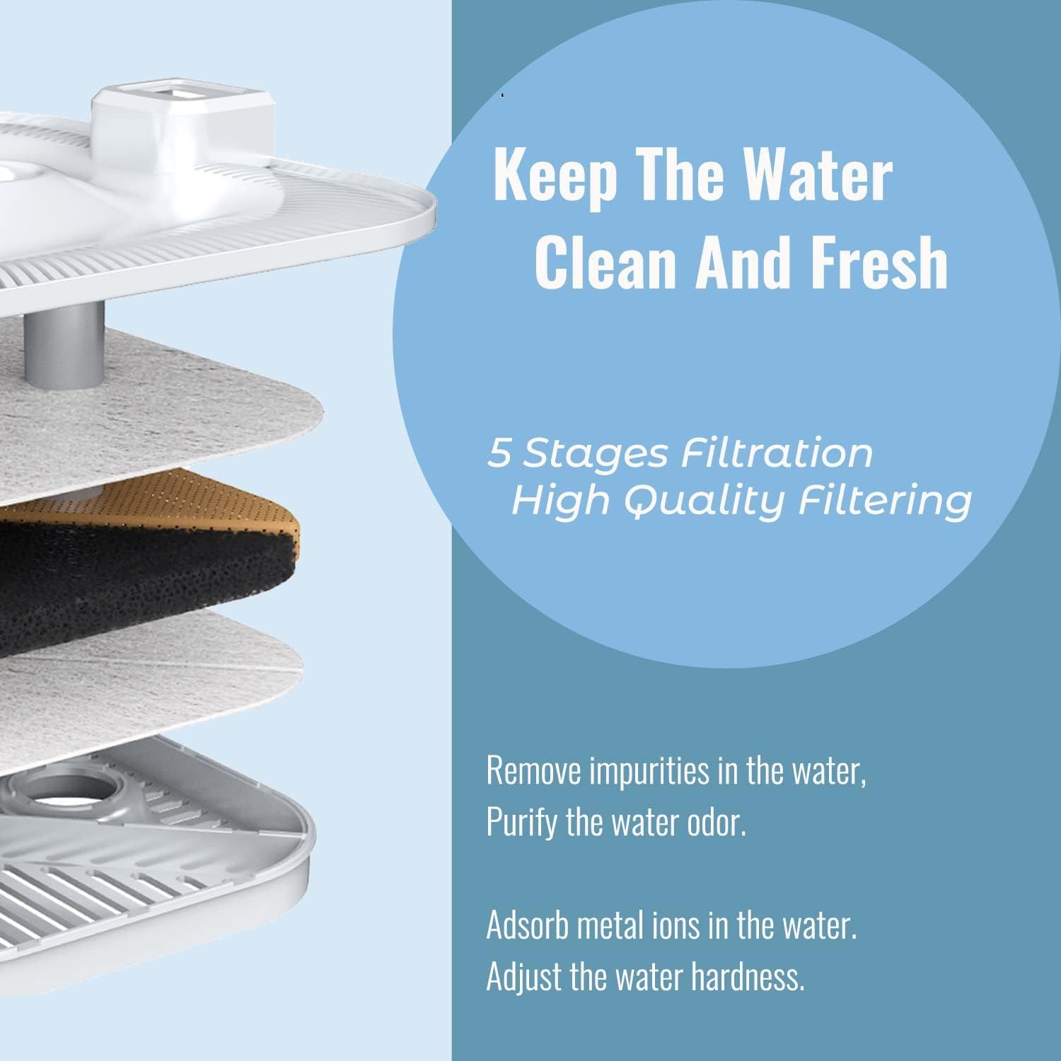 [5 Stages Filtration]This cat fountain has 5 kinds of filtering substances. After 5 stages of filtration, not only can remove impurities in the water, purify the water odor, but also can adsorb metal ions in the water and adjust the water hardness. Let your pets can drink high-quality water.