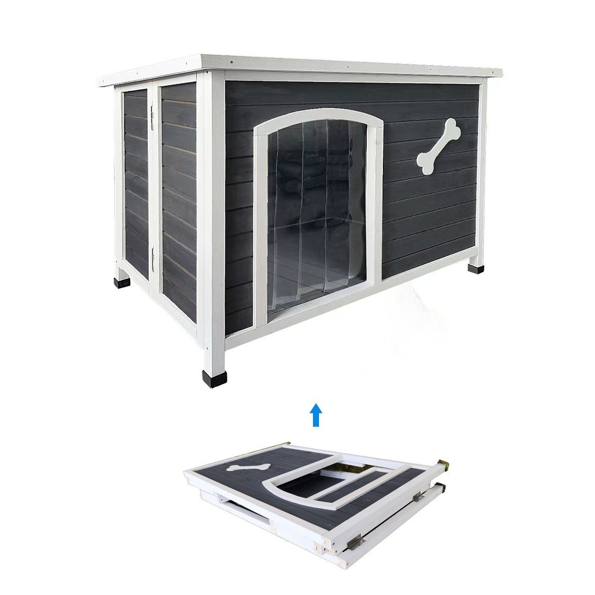 Easy to Assemble: This pet house can be folded,Adults can assemble in about 5 minutes.Secure and Durable: This outdoor dog house is built with painted solid woods, ensuring a secure and cozy space. It´s an ideal shelter to protect your pet against inclement weather.Weather-Resistant Design:Featuring a waterproof asphalt roof and elevated floor design with plastic feet, this outside dog house is leak-proof during rainy or snowy days. The raised floor creates a dry and ventilated surface, promoting your pet´s health and wellbeing.Easy to clean: It´s easy to gain access to the inside by opening the roof and the bottom floor can be removed for daily cleaning.Dimensions:40.55" L x 25.2" W x 29.25" H,for dog under 70 lbs.