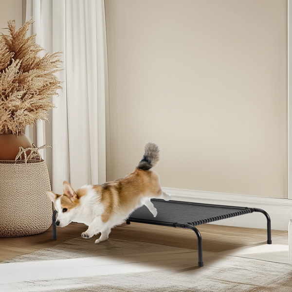 High-quality structure: Large elevated dog bed. Composed of powder-coated steel and Textilene mesh. Breathable fabric promotes air circulation on all sides of the bed, keeping your dog cool and comfortable all year long. The thickened steel material can hold up to 60 pounds.The height is just right for dogs of all ages, from puppies to old.