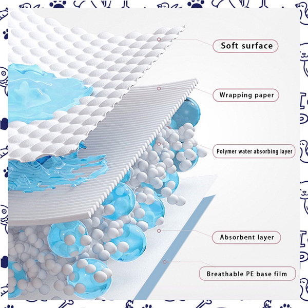 • [5-LAYER CONSTRUCTION] Our training pads are made with 5 layers: non-woven cloth as the first layer to allow urine to flow through; the second and the fourth layers are made from paper tissue to add absorbency; the third layer is also the core layer is made from super-absorbent polymer, and the back layer is a water-proof plastic protecting layer.