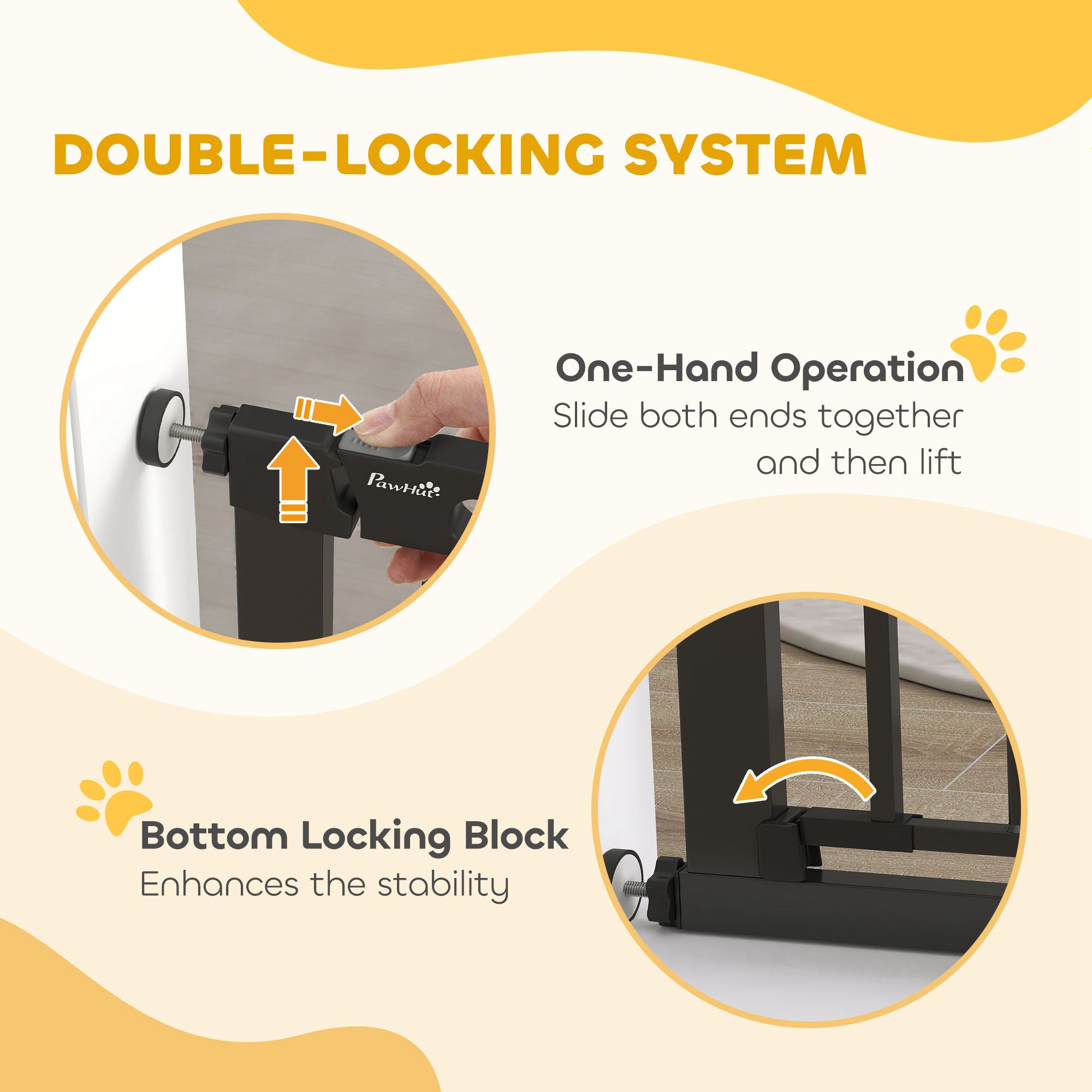 Keep pets away from rooms when required with the Pawhut dog gates with walk through door. Made from metal with lead-free treated surface for strength and safety. Ranges from 29.5" to 51.6"(75 - 131 cm) wide, allowing it to fit into different sized spaces with ease. Slide and lift, the handle is easy to open, allowing you to pass through quickly without your pet escaping for security. Double locking mechanism ensures your pet secured in a place to provide maximum safety.